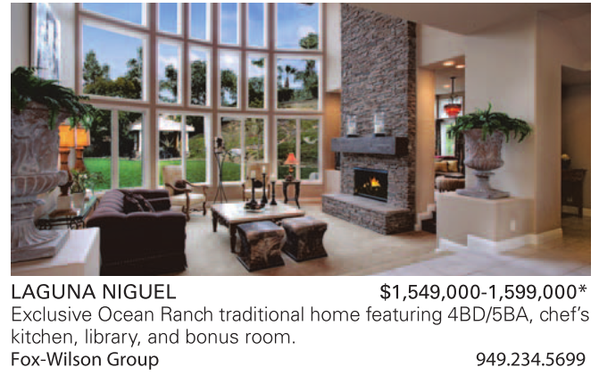 LAGUNA NIGUEL $1,549,000-1,599,000* Exclusive Ocean Ranch traditional home featuring 4BD/5BA, chef’s kitchen, library, and bonus room. Fox-Wilson Group 949.234.5699
