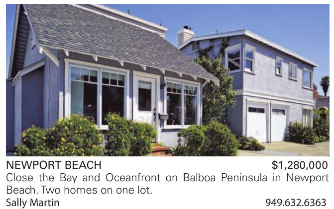 NEWPORT BEACH $1,280,000 Close the Bay and Oceanfront on Balboa Peninsula in Newport Beach. Two homes on one lot. Sally Martin 949.632.6363