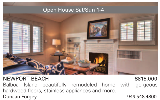 NEWPORT BEACH $815,000 Balboa Island beautifully remodeled home with gorgeous hardwood floors, stainless appliances and more. Duncan Forgey 949.548.4800