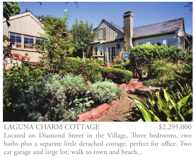LAGUNA CHARM COTTAGE $2,295,000 Located on Diamond Street in the Village, Three bedrooms, two baths plus a separate little detached cottage, perfect for office. Two car garage and large lot, walk to town and beach...