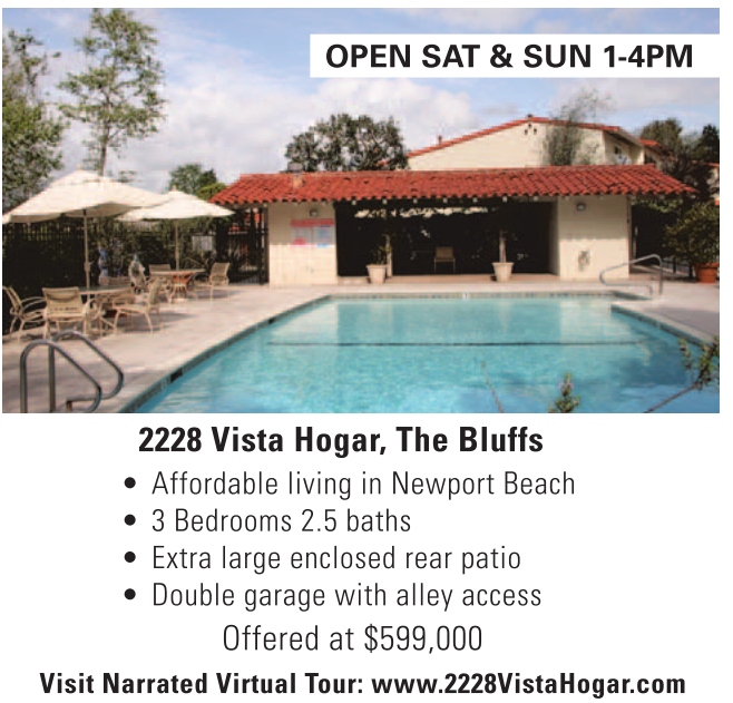 2228 Vista Hogar, The Bluffs • Affordable living in Newport Beach • 3 Bedrooms 2.5 baths • Extra large enclosed rear patio • Double garage with alley access Offered at $599,000 Visit Narrated Virtual Tour: www.2228VistaHogar.com