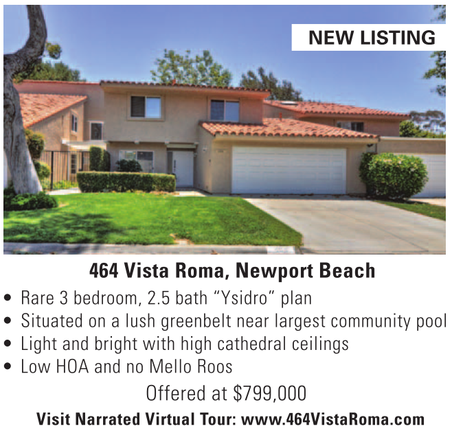 NEW LISTING 464 Vista Roma, Newport Beach • Rare 3 bedroom, 2.5 bath “Ysidro” plan • Situated on a lush greenbelt near largest community pool • Light and bright with high cathedral ceilings • Low HOA and no Mello Roos Offered at $799,000 Visit Narrated Virtual Tour: www.464VistaRoma.com