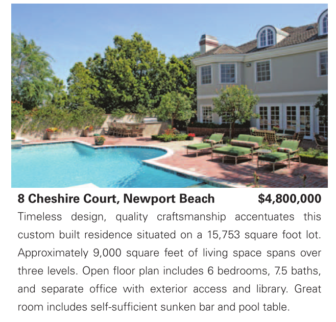 8 Cheshire Court, Newport Beach $4,800,000 Timeless design, quality craftsmanship accentuates this custom built residence situated on a 15,753 square foot lot. Approximately 9,000 square feet of living space spans over three levels. Open floor plan includes 6 bedrooms, 7.5 baths, and separate office with exterior access and library. Great room includes self-sufficient sunken bar and pool table.