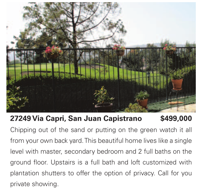 27249 Via Capri, San Juan Capistrano $499,000 Chipping out of the sand or putting on the green watch it all from your own back yard. This beautiful home lives like a single level with master, secondary bedroom and 2 full baths on the ground floor. Upstairs is a full bath and loft customized with plantation shutters to offer the option of privacy. Call for you private showing.