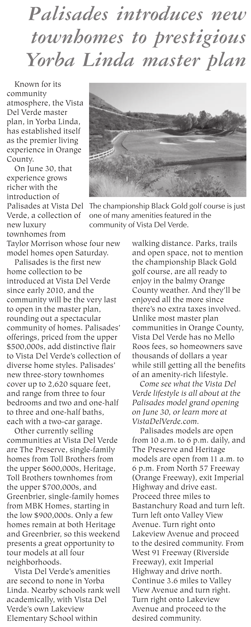 Come see what the Vista Del Verde lifestyle is all about at the Palisades model grand opening on June 30, or learn more at VistaDelVerde.com.
