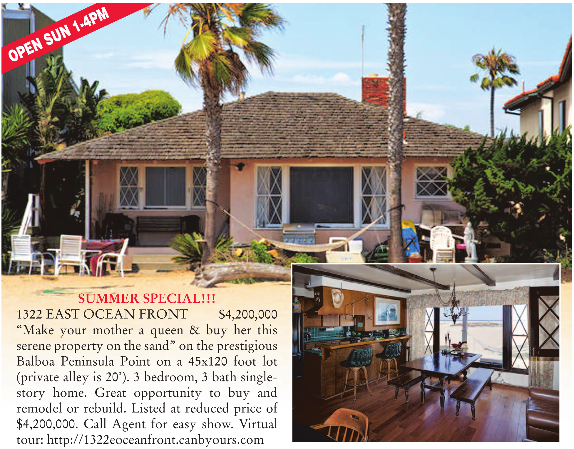 SUMMER SPECIAL!!! 1322 EAST OCEAN FRONT $4,200,000 “Make your mother a queen & buy her this serene property on the sand” on the prestigious Balboa Peninsula Point on a 45x120 foot lot (private alley is 20’). 3 bedroom, 3 bath singlestory home. Great opportunity to buy and remodel or rebuild. Listed at reduced price of $4,200,000. Call Agent for easy show. Virtual tour: http://1322eoceanfront.canbyours.com