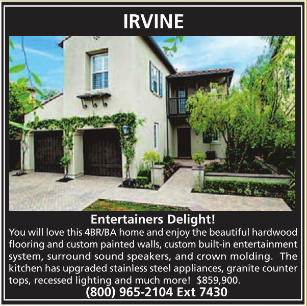 IRVINE Entertainers Delight! You will love this 4BR/BA home and enjoy the beautiful hardwood flooring and custom painted walls, custom built-in entertainment system, surround sound speakers, and crown molding. The kitchen has upgraded stainless steel appliances, granite counter tops, recessed lighting and much more! $859,900. (800) 965-2104 Ext 7430 See also