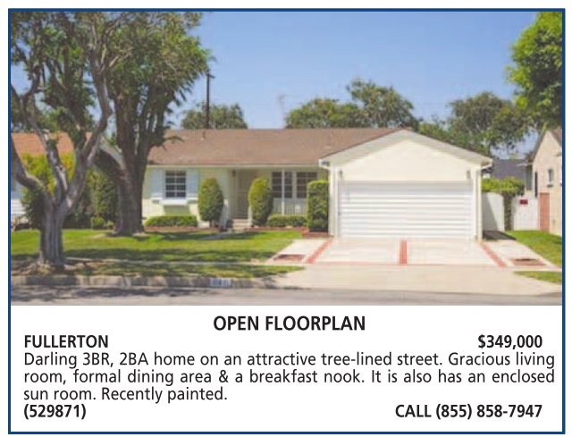 OPEN FLOORPLAN FULLERTON $349,000 Darling 3BR, 2BA home on an attractive tree-lined street. Gracious living room, formal dining area & a breakfast nook. It is also has an enclosed sun room. Recently painted. (529871) CALL (855) 858-7947