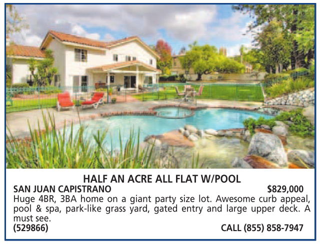 HALF AN ACRE ALL FLAT W/POOL SAN JUAN CAPISTRANO $829,000 Huge 4BR, 3BA home on a giant party size lot. Awesome curb appeal, pool & spa, park-like grass yard, gated entry and large upper deck. A must see. (529866) CALL (855) 858-7947