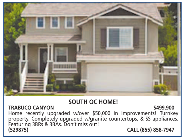 TRABUCO CANYON $499,900 Home recently upgraded w/over $50,000 in improvements! Turnkey property. Completely upgraded w/granite countertops, & SS appliances. Featuring 3BRs & 3BAs. Don’t miss out! (529875) CALL (855) 858-7947