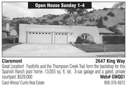 Open House Sunday 1-4 Claremont 2647 King Way Great Location! Foothills and the Thompson Creek Trail form the backdrop for this Spanish Ranch pool home. 13,055 sq. ft. lot, 3-car garage and a gated, private courtyard. $529,000 Web# GWQG1 Carol Wiese/ Curtis Real Estate 909-376-8972 See also