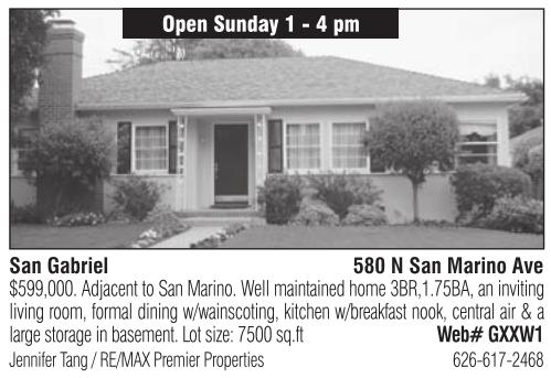Open Sunday 1 - 4 pm San Gabriel 580 N San Marino Ave $599,000. Adjacent to San Marino. Well maintained home 3BR,1.75BA, an inviting living room, formal dining w/wainscoting, kitchen w/breakfast nook, central air & a large storage in basement. Lot size: 7500 sq.ft Web# GXXW1 Jennifer Tang / RE/MAX Premier Properties 626-617-2468