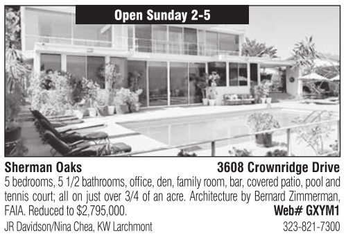 Open Sunday 2-5 Sherman Oaks 3608 Crownridge Drive 5 bedrooms, 5 1/2 bathrooms, office, den, family room, bar, covered patio, pool and tennis court; all on just over 3/4 of an acre. Architecture by Bernard Zimmerman, FAIA. Reduced to $2,795,000. Web# GXYM1 JR Davidson/Nina Chea, KW Larchmont 323-821-7300