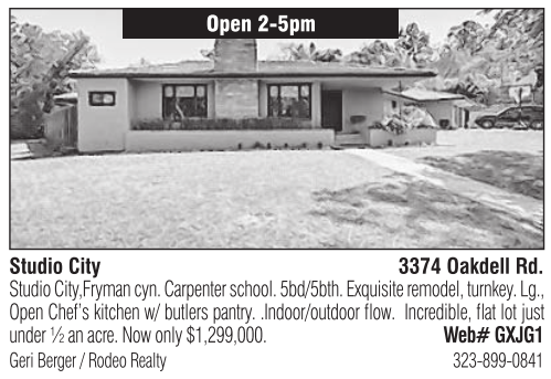 Open 2-5pm Studio City 3374 Oakdell Rd. Studio City,Fryman cyn. Carpenter school. 5bd/5bth. Exquisite remodel, turnkey. Lg., Open Chef’s kitchen w/ butlers pantry. .Indoor/outdoor flow. Incredible, flat lot just under 1⁄2 an acre. Now only $1,299,000. Web# GXJG1 Geri Berger / Rodeo Realty 323-899-0841