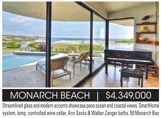 Streamlined glass and modern accents showcase pano ocean and coastal views. SmartHome system, temp. controlled wine cellar, Ann Sacks & Walker Zanger baths. 50 Monarch Bay