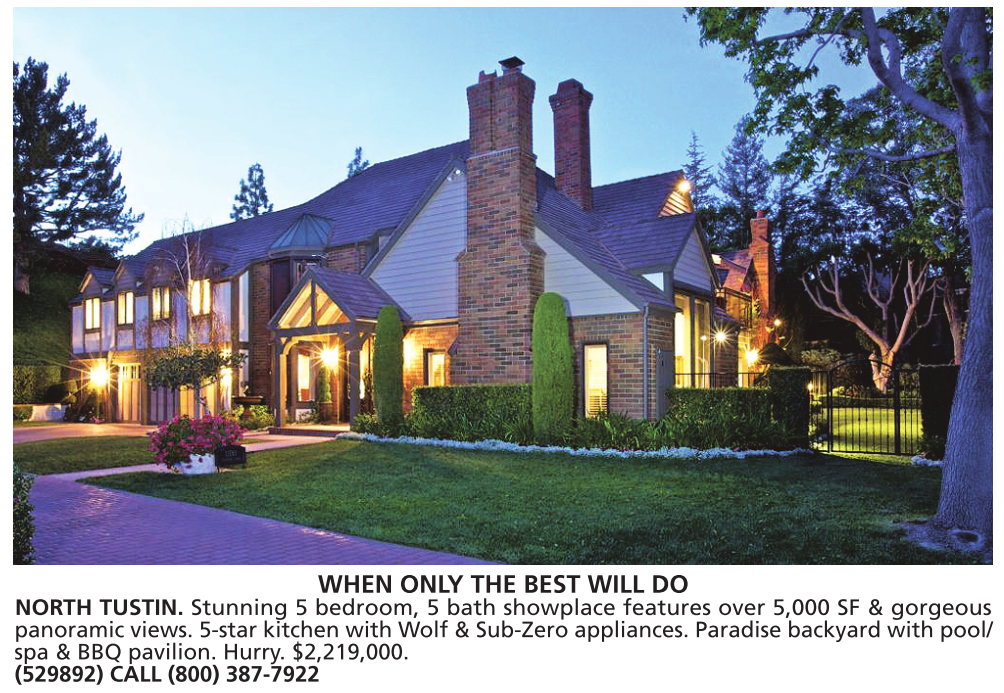 WHEN ONLY THE BEST WILL DO NORTH TUSTIN. Stunning 5 bedroom, 5 bath showplace features over 5,000 SF & gorgeous panoramic views. 5-star kitchen with Wolf & Sub-Zero appliances. Paradise backyard with pool/ spa & BBQ pavilion. Hurry. $2,219,000. (529892) CALL (800) 387-7922