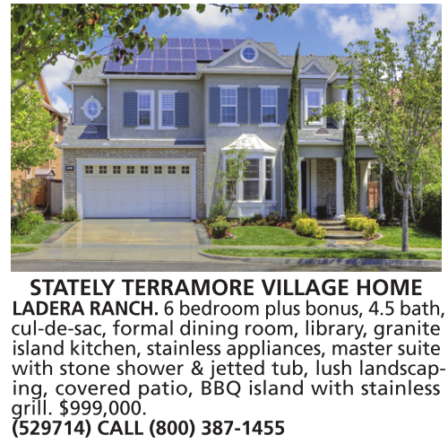 STATELY TERRAMORE VILLAGE HOME LADERA RANCH. 6 bedroom plus bonus, 4.5 bath, cul-de-sac, formal dining room, library, granite island kitchen, stainless appliances, master suite with stone shower & jetted tub, lush landscaping, covered patio, BBQ island with stainless grill. $999,000. (529714) CALL (800) 387-1455