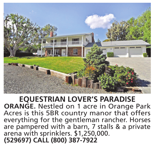 EQUESTRIAN LOVER’S PARADISE ORANGE. Nestled on 1 acre in Orange Park Acres is this 5BR country manor that offers everything for the gentleman rancher. Horses are pampered with a barn, 7 stalls & a private arena with sprinklers. $1,250,000. (529697) CALL (800) 387-7922