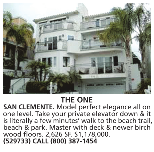 THE ONE SAN CLEMENTE. Model perfect elegance all on one level. Take your private elevator down & it is literally a few minutes’ walk to the beach trail, beach & park. Master with deck & newer birch wood floors. 2,626 SF. $1,178,000. (529733) CALL (800) 387-1454