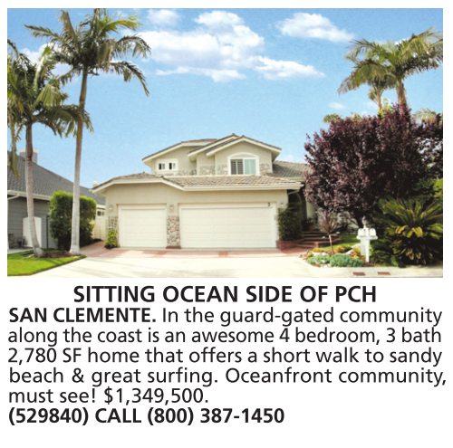SITTING OCEAN SIDE OF PCH SAN CLEMENTE. In the guard-gated community along the coast is an awesome 4 bedroom, 3 bath 2,780 SF home that offers a short walk to sandy beach & great surfing. Oceanfront community, must see! $1,349,500. (529840) CALL (800) 387-1450