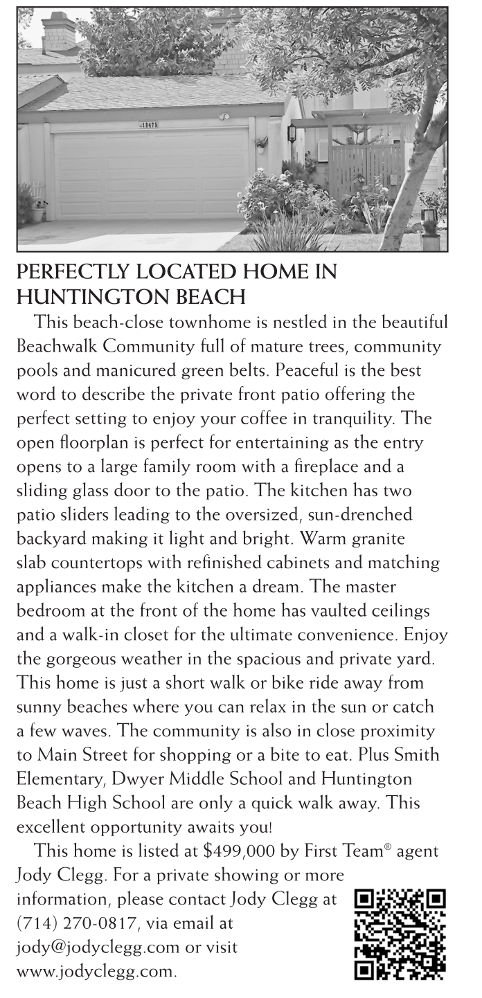 PERFECTLY LOCATED HOME IN HUNTINGTON BEACH This beach-close townhome is nestled in the beautiful Beachwalk Community full of mature trees, community pools and manicured green belts. Peaceful is the best word to describe the private front patio offering the perfect setting to enjoy your coffee in tranquility. The open fl oorplan is perfect for entertaining as the entry opens to a large family room with a fi replace and a sliding glass door to the patio. The kitchen has two patio sliders leading to the oversized, sun-drenched backyard making it light and bright. Warm granite slab countertops with refi nished cabinets and matching appliances make the kitchen a dream. The master bedroom at the front of the home has vaulted ceilings and a walk-in closet for the ultimate convenience. Enjoy the gorgeous weather in the spacious and private yard. This home is just a short walk or bike ride away from sunny beaches where you can relax in the sun or catch a few waves. The community is also in close proximity to Main Street for shopping or a bite to eat. Plus Smith Elementary, Dwyer Middle School and Huntington Beach High School are only a quick walk away. This excellent opportunity awaits you! This home is listed at $499,000 by First Team ® agent Jody Clegg. For a private showing or more information, please contact Jody Clegg at (714) 270-0817, via email at jody@jodyclegg.com or visit www.jodyclegg.com.