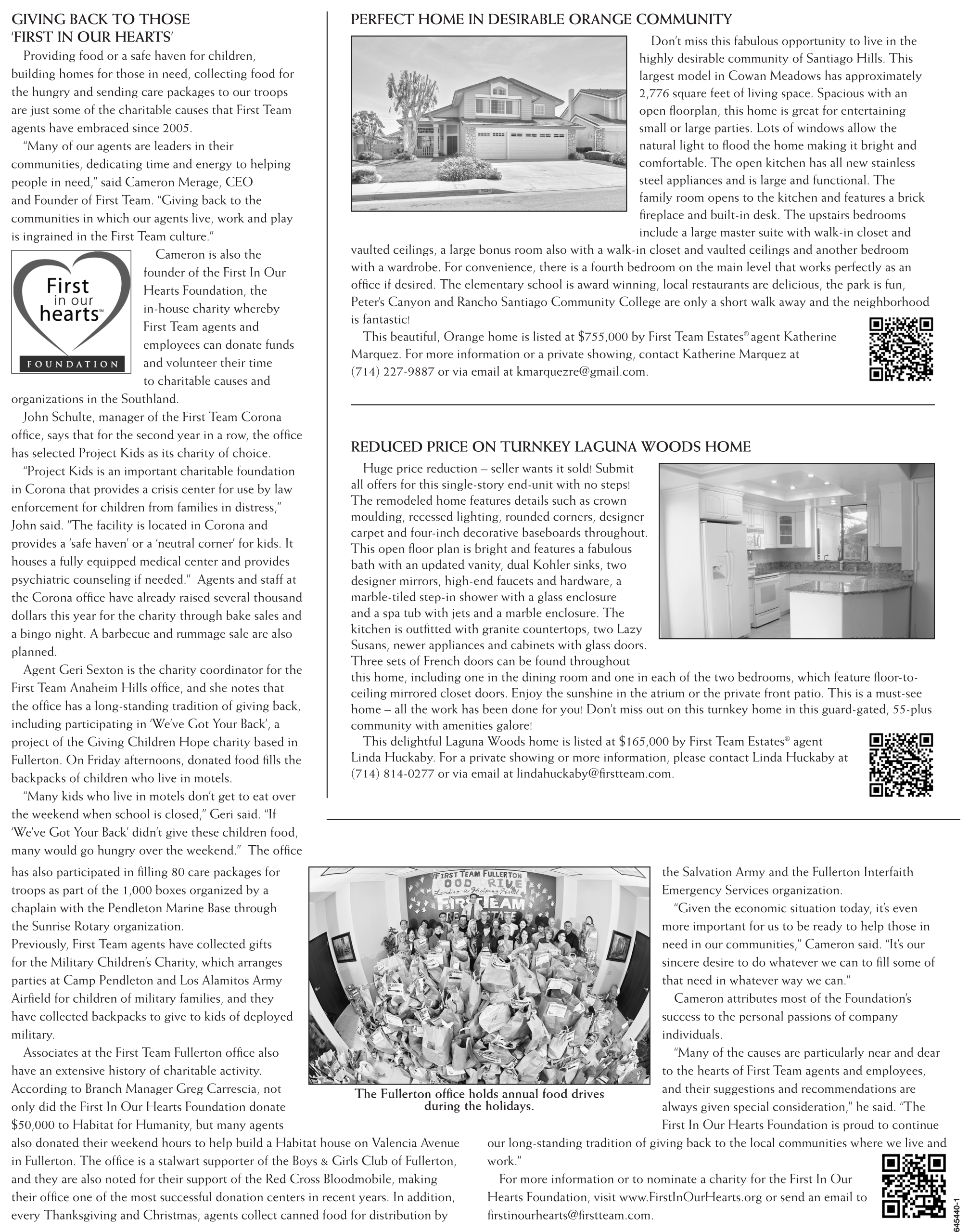 Associates at the First Team Fullerton offi ce also have an extensive history of charitable activity. According to Branch Manager Greg Carrescia, not only did the First In Our Hearts Foundation donate $50,000 to Habitat for Humanity, but many agents The Fullerton offi ce holds annual food drives during the holidays.