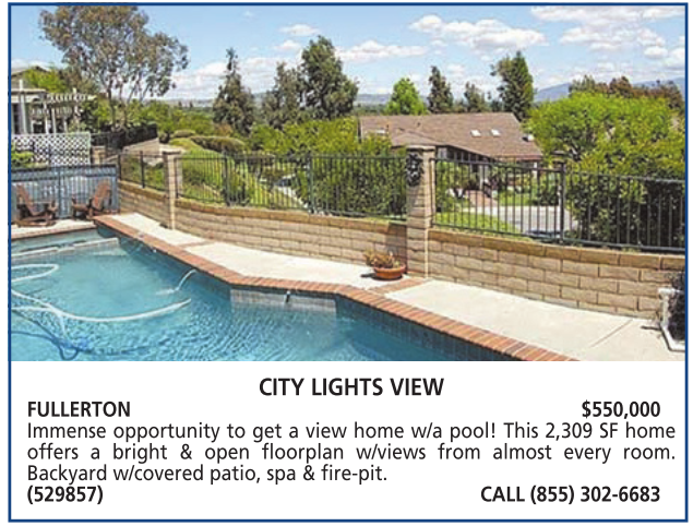 CITY LIGHTS VIEW FULLERTON $550,000 Immense opportunity to get a view home w/a pool! This 2,309 SF home offers a bright & open floorplan w/views from almost every room. Backyard w/covered patio, spa & fire-pit. (529857) CALL (855) 302-6683