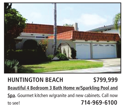 HUNTINGTON BEACH $799,999 Beautiful 4 Bedroom 3 Bath Home w/Sparkling Pool and Spa. Gourmet kitchen w/granite and new cabinets. Call now to see! 714-969-6100