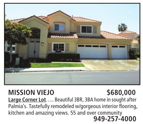 MISSION VIEJO $680,000 Large Corner Lot….. Beautiful 3BR, 3BA home in sought after Palmia’s. Tastefully remodeled w/gorgeous interior fl ooring, kitchen and amazing views. 55 and over community 949-257-4000