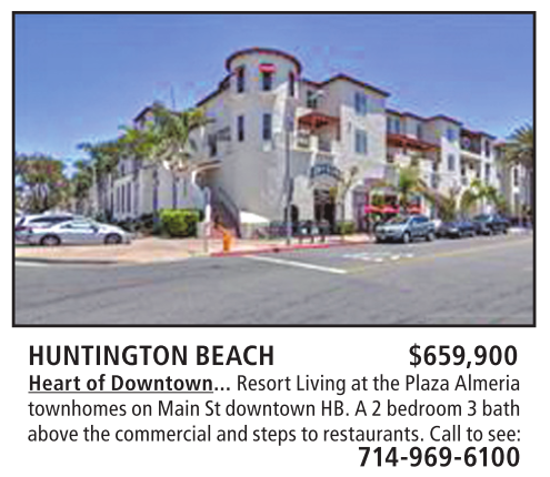 HUNTINGTON BEACH $659,900 Heart of Downtown... Resort Living at the Plaza Almeria townhomes on Main St downtown HB. A 2 bedroom 3 bath above the commercial and steps to restaurants. Call to see: