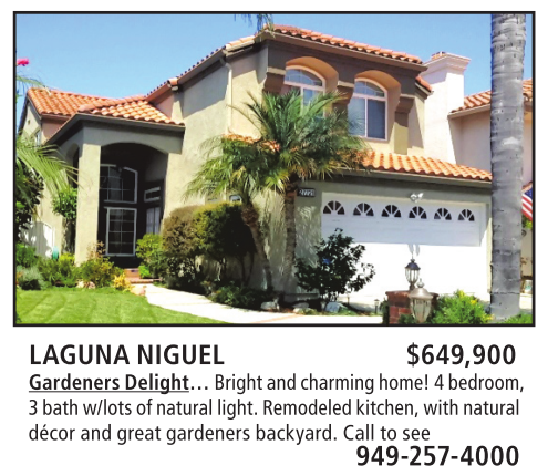 LAGUNA NIGUEL $649,900 Gardeners Delight… Bright and charming home! 4 bedroom, 3 bath w/lots of natural light. Remodeled kitchen, with natural décor and great gardeners backyard. Call to see 949-257-4000