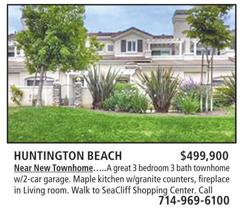 HUNTINGTON BEACH $499,900 Near New Townhome…..A great 3 bedroom 3 bath townhome w/2-car garage. Maple kitchen w/granite counters, fireplace in Living room. Walk to SeaCliff Shopping Center. Call 714-969-6100
