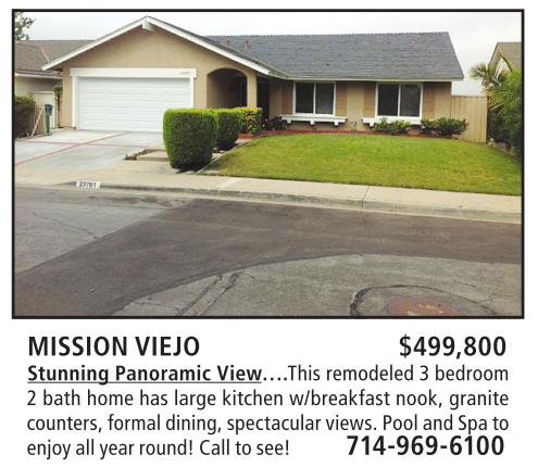 MISSION VIEJO $499,800 Stunning Panoramic View….This remodeled 3 bedroom 2 bath home has large kitchen w/breakfast nook, granite counters, formal dining, spectacular views. Pool and Spa to enjoy all year round! Call to see! 714-969-6100