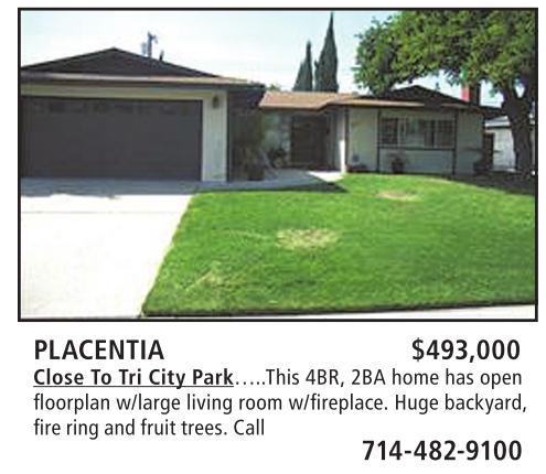 PLACENTIA $493,000 Close To Tri City Park…..This 4BR, 2BA home has open fl oorplan w/large living room w/fi replace. Huge backyard, fire ring and fruit trees. Call 714-482-9100