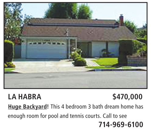 LA HABRA $470,000 Huge Backyard! This 4 bedroom 3 bath dream home has enough room for pool and tennis courts. Call to see 714-969-6100