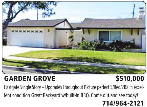 GARDEN GROVE $510,000 Eastgate Single Story – Upgrades Throughout Picture perfect 3/Bed/2Ba in excellent condition Great Backyard w/built-in BBQ. Come out and see today!