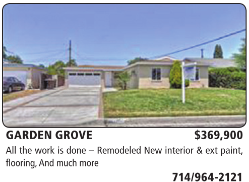 GARDEN GROVE $369,900 All the work is done – Remodeled New interior & ext paint, flooring, And much more 714/964-2121