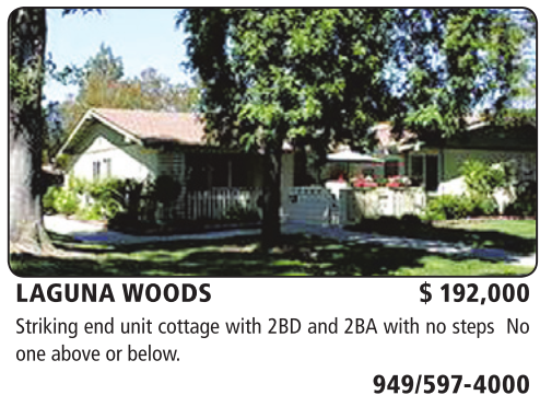 LAGUNA WOODS $ 192,000 Striking end unit cottage with 2BD and 2BA with no steps No one above or below.