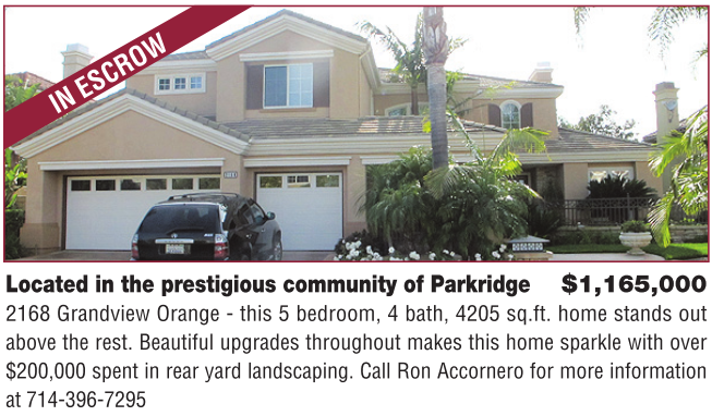 Located in the prestigious community of Parkridge $1,165,000 2168 Grandview Orange - this 5 bedroom, 4 bath, 4205 sq.ft. home stands out above the rest. Beautiful upgrades throughout makes this home sparkle with over $200,000 spent in rear yard landscaping. Call Ron Accornero for more information at 714-396-7295