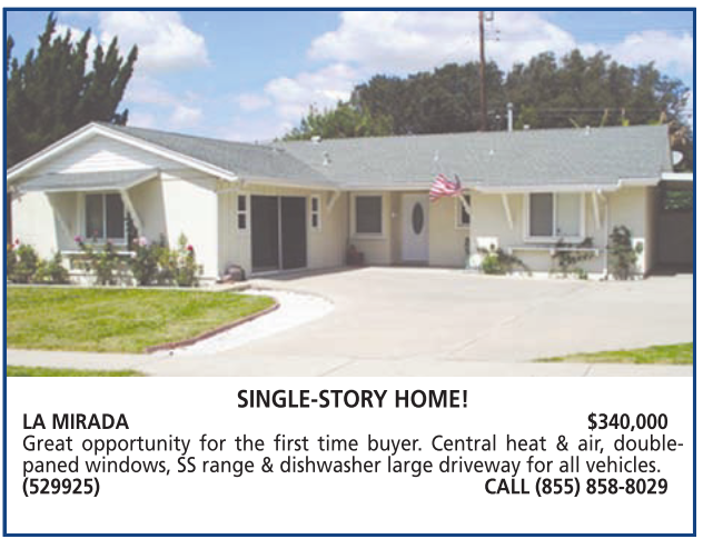 LA MIRADA $340,000 Great opportunity for the first time buyer. Central heat & air, doublepaned windows, SS range & dishwasher large driveway for all vehicles.