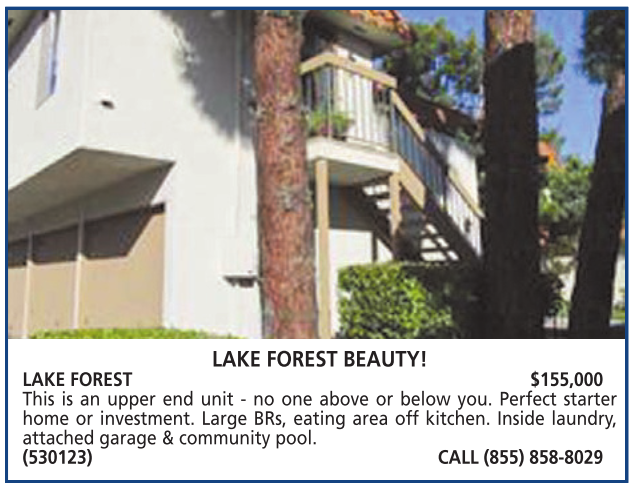LAKE FOREST $155,000 This is an upper end unit - no one above or below you. Perfect starter home or investment. Large BRs, eating area off kitchen. Inside laundry, attached garage & community pool. (530123) CALL (855) 858-8029