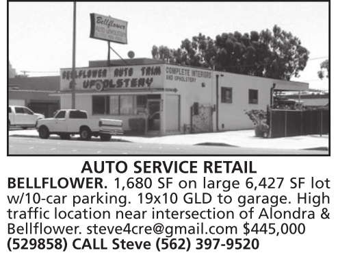 AUTO SERVICE RETAIL BELLFLOWER. 1,680 SF on large 6,427 SF lot w/10-car parking. 19x10 GLD to garage. High traffic location near intersection of Alondra & Bellflower. steve4cre@gmail.com $445,000 (529858) CALL Steve (562) 397-9520