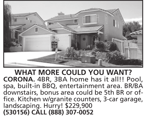 WHAT MORE COULD YOU WANT? CORONA. 4BR, 3BA home has it all!! Pool, spa, built-in BBQ, entertainment area. BR/BA downstairs, bonus area could be 5th BR or office. Kitchen w/granite counters, 3-car garage, landscaping. Hurry! $229,900 (530156) CALL (888) 307-0052