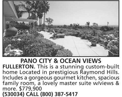 PANO CITY & OCEAN VIEWS FULLERTON. This is a stunning custom-built home Located in prestigious Raymond Hills. Includes a gorgeous gourmet kitchen, spacious family room, a lovely master suite w/views & more. $779,900 (530034) CALL (800) 387-5417