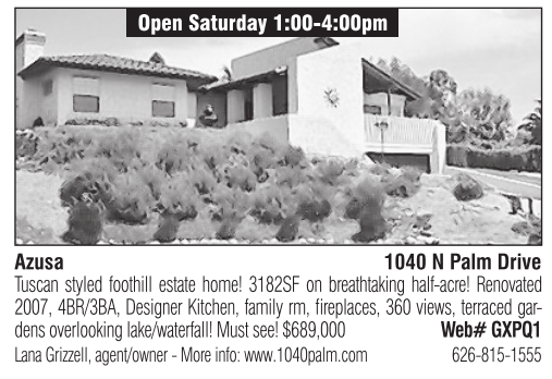Open Saturday 1:00-4:00pm Azusa 1040 N Palm Drive Tuscan styled foothill estate home! 3182SF on breathtaking half-acre! Renovated 2007, 4BR/3BA, Designer Kitchen, family rm, fireplaces, 360 views, terraced gardens overlooking lake/waterfall! Must see! $689,000 Web# GXPQ1 Lana Grizzell, agent/owner - More info: www.1040palm.com 626-815-1555
