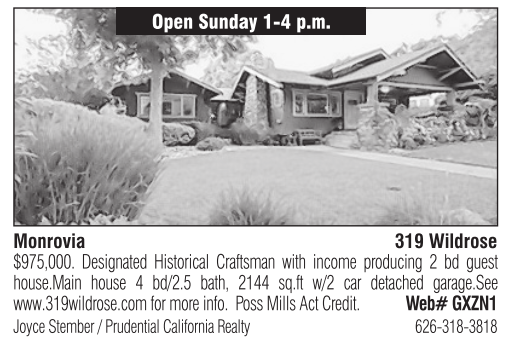 $975,000. Designated Historical Craftsman with income producing 2 bd guest house.Main house 4 bd/2.5 bath, 2144 sq.ft w/2 car detached garage.See www.319wildrose.com for more info. Poss Mills Act Credit. Web# GXZN1 Joyce Stember / Prudential California Realty 626-318-3818