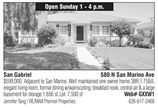 San Gabriel 580 N San Marino Ave $599,000. Adjacent to San Marino. Well maintained one owner home 3BR,1.75BA, elegant living room, formal dining w/wainscoting, breakfast nook, central air & a large basement for storage.1,656 sf.,Lot: 7,500 sf Web# GXXW1 Jennifer Tang / RE/MAX Premier Properties 626-617-2468