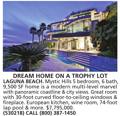 DREAM HOME ON A TROPHY LOT LAGUNA BEACH. Mystic Hills 5 bedroom, 6 bath, 9,500 SF home is a modern multi-level marvel with panoramic coastline & city views. Great room with 30-foot curved floor-to-ceiling windows & fireplace. European kitchen, wine room, 74-foot lap pool & more. $7,795,000. (530218) CALL (800) 387-1450