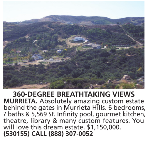360-DEGREE BREATHTAKING VIEWS MURRIETA. Absolutely amazing custom estate behind the gates in Murrieta Hills. 6 bedrooms, 7 baths & 5,569 SF. Infinity pool, gourmet kitchen, theatre, library & many custom features. You will love this dream estate. $1,150,000. (530155) CALL (888) 307-0052