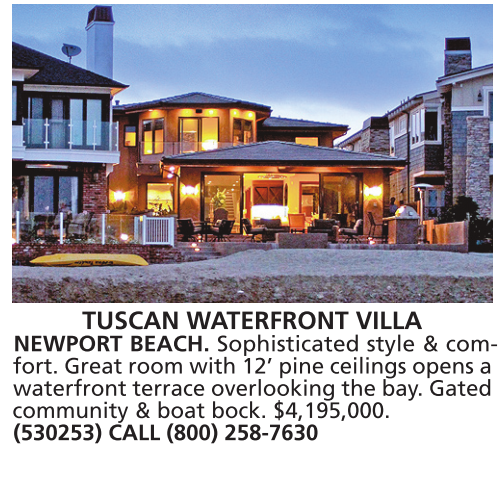 TUSCAN WATERFRONT VILLA NEWPORT BEACH. Sophisticated style & comfort. Great room with 12’ pine ceilings opens a waterfront terrace overlooking the bay. Gated community & boat bock. $4,195,000.